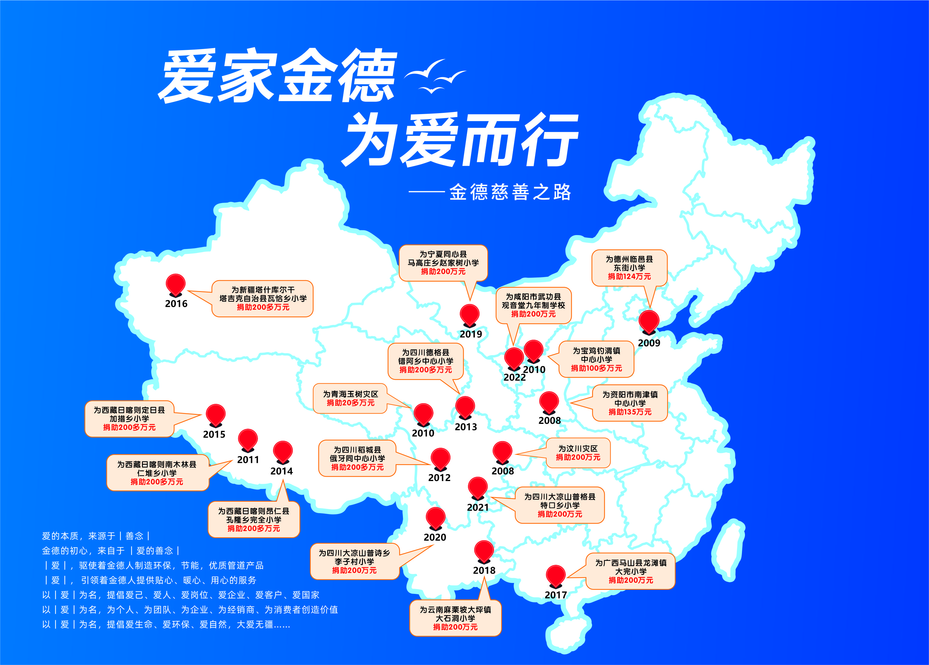 為了銘記汶川地震,也為了幫助更多貧困地區(qū)的孩子們得到更好的教育,金德管業(yè)集團把每年的五月份定為企業(yè)的慈善月。每年五月,金德管業(yè)集團全體員工和廣大經(jīng)銷商朋友都會慷慨解囊,捐助一所希望小學,期間金德人做慈善的腳步從未中斷過。
